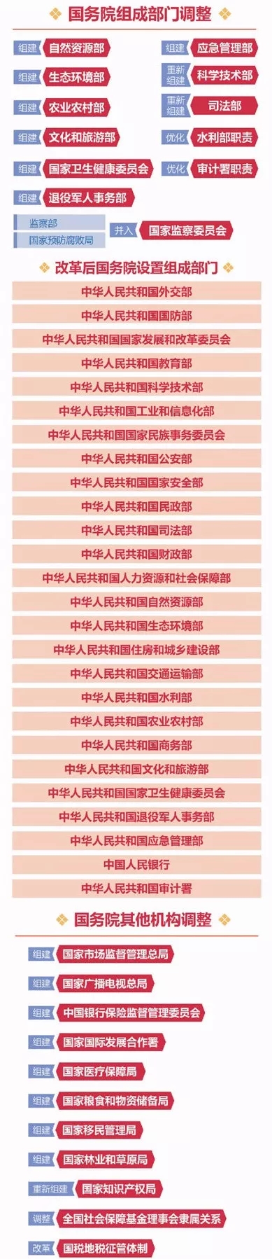 The reform programme of the State Council has been submitted to the thirteen session of the National People's Congress for consideration. According to this scheme, the State Council has reduced 8 ministries and 7 sub ministerial institutions, and 26 departments have been set up by the State Council in addition to the general office of the State Council.