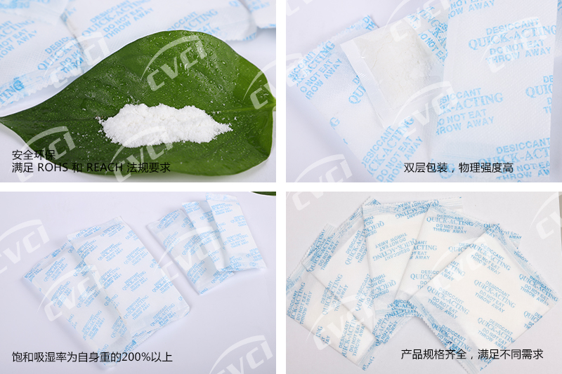速效干燥劑是以高效活性吸附物為原料,經(jīng)精確計(jì)算,科學(xué)調(diào)配后組成。包裝采用杜邦紙與高級無紡布雙層包裝,印刷精美,使用方便。該產(chǎn)品規(guī)格齊全,可滿足不同產(chǎn)品的防潮、防銹包裝需求。